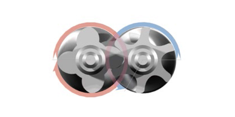 - 主轉子轉速高,直徑大,副 轉子轉速較低,直徑較小, 復盛型線轉子的直徑比和轉 速比成正比,這個設計使兩 個轉子的剛度完全相等。