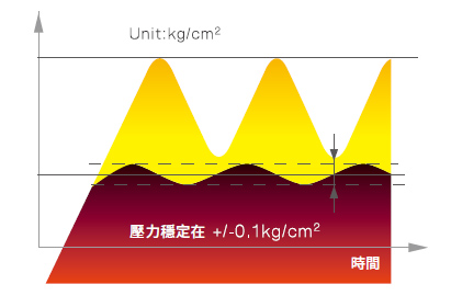 變頻控制可以即時反應客戶使用的風量變化,供氣 壓力波動穩定在±0.1kg/cm²以下,沒有傳統空壓 機空重車壓差值所需1-2kg/cm²的設定。