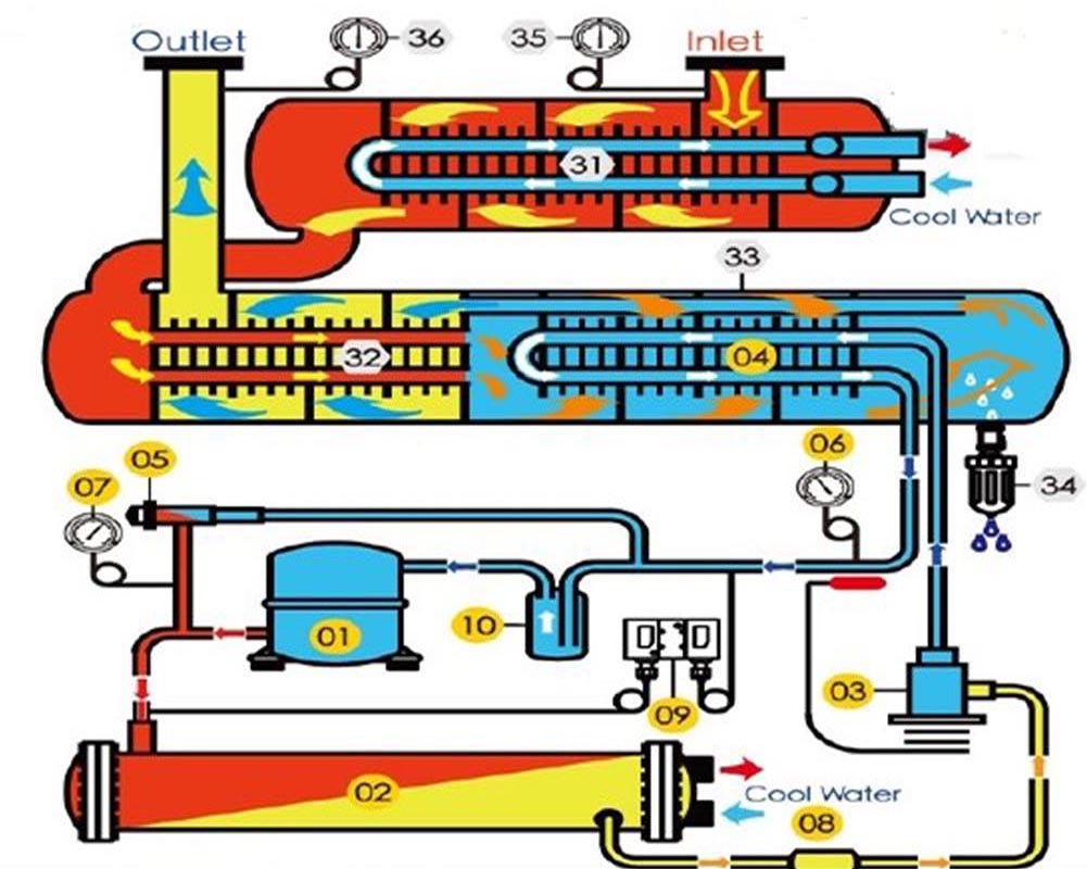 回收更多乾燥出口冷氣冷卻源,大幅降低進入冷媒蒸氣發氣空氣溫度,減少冷媒壓縮機負載,將低電力消耗。